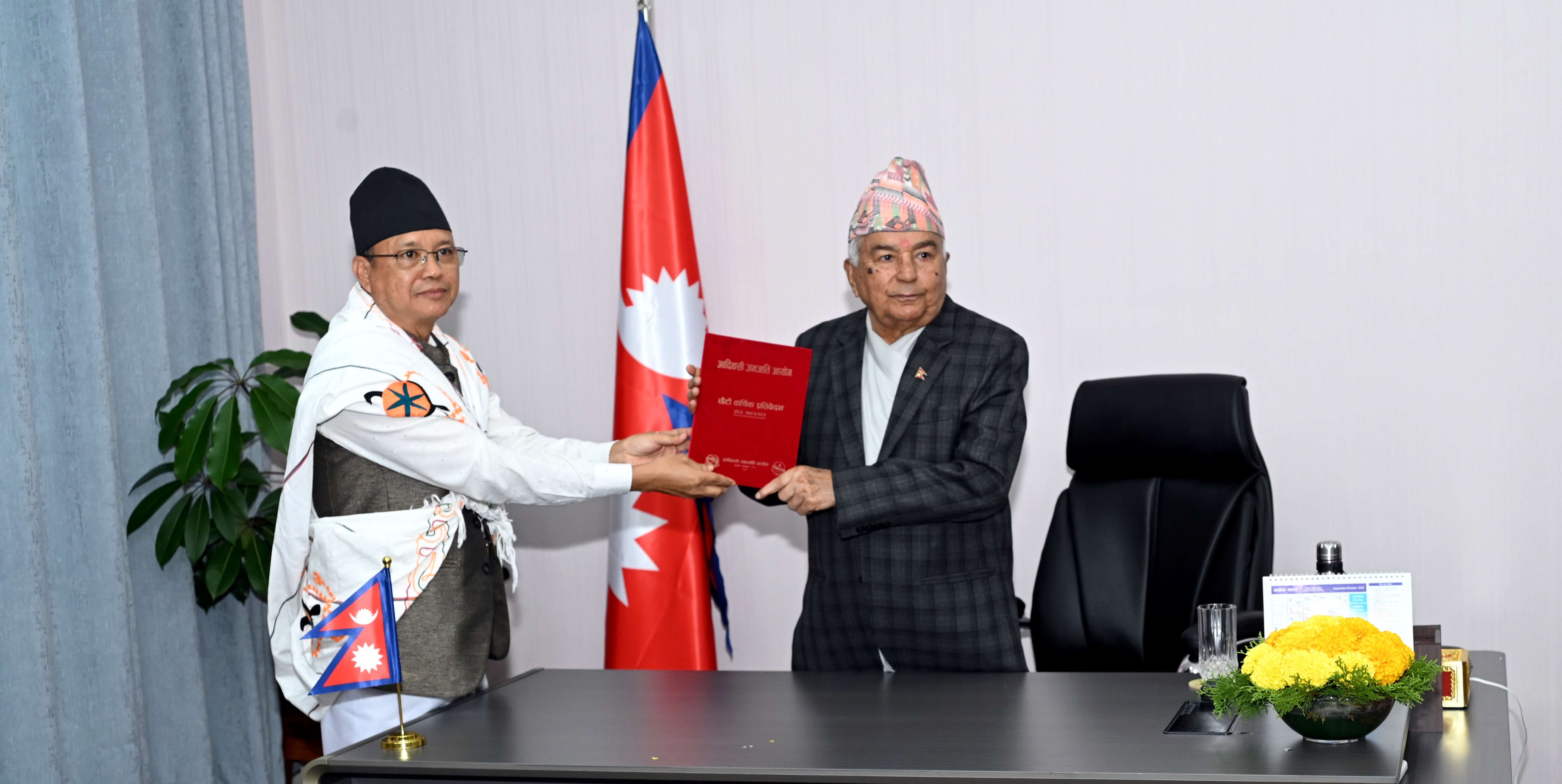 सम्माननीय राष्ट्रपतिज्यू समक्ष आयोगका मा. अध्यक्ष रामबहादुर थापामगरले छैटौं वार्षिक प्रतिवेदन पेेश गर्नुहुँदै